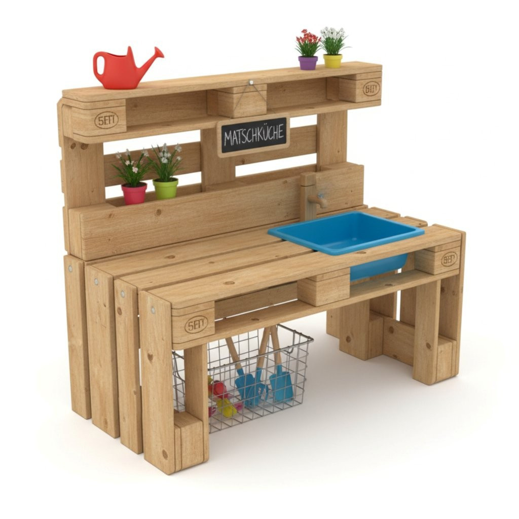 Eine Matschküche passt ideal unter das Podest des Spielturms: Es ist schattig, oft schon sandig, und der Bereich lässt sich wunderbar in eine kleine "Outdoor-Küche" verwandeln. Viele erinnern sich selbst gern daran, wie viel Freude Matschspiele in der eigenen Kindheit gemacht haben. Ganz nebenbei fördern Sie die taktile Wahrnehmung Ihres Kindes und regen kreative Rollenspiele an.