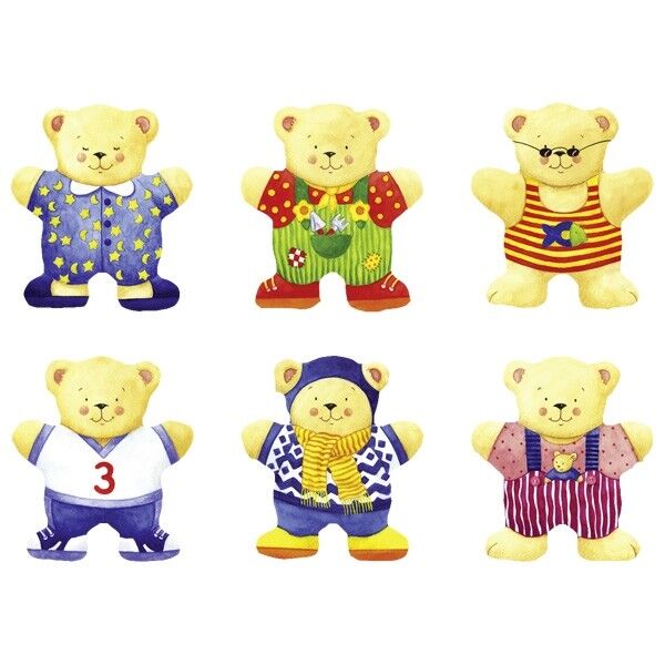 - Kreatives Anziehpuzzle mit 18 Teilen: Kombinieren Sie Hosen, Oberteile und Bärenköpfe (je 6 verschiedene) für endlosen Spielspaß.