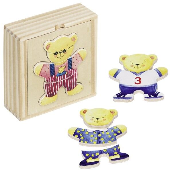 Mit 18 verschiedenen Puzzleteilen können kleine Kreative immer wieder neue Outfits für den niedlichen Bären kreieren. Das Set besteht aus je 6 Hosen, Oberteilen und Bärenköpfen für immer neue Kombinationen. Der praktische Holzkasten mit bärenförmiger Vertiefung im Deckel ermöglicht ein einfaches und sicheres Ankleiden ohne Verrutschen der Teile. Dieses langlebige und hochwertig gestaltete Puzzle fördert die motorischen Fähigkeiten und die Fantasie Ihres Kindes. Ideal als Geschenk und für gemeinsame Spielmomente, unterstützt es die soziale und kognitive Entwicklung. Vertrauen Sie auf die Qualität und den pädagogischen Wert dieses liebevoll gestalteten Puzzles.