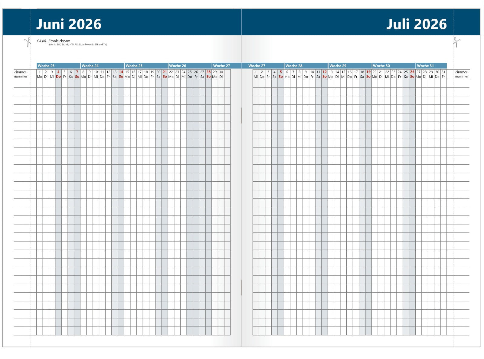Unser Zimmerbelegungskalender 2026 ist der ideale Begleiter für Hotels, Vermieter von Ferienwohnungen und andere Beherbergungsbetriebe. Die großzügige Tabellenübersicht erlaubt die Planung von bis zu 30 Zimmern, Ferienwohnungen o.ä. über einen Zeitraum von insgesamt 14 Monaten – von Dezember 2025 bis Januar 2027. Die praktische A4 Broschüre ist drahtgeheftet und liegt dank hochwertigem, 150g/qm starkem Offset-Papier angenehm in der Hand. Die Oberfläche ist leicht beschreibbar, sodass Reservierungen und Belegungen sowohl mit Kugelschreiber als auch mit Bleistift oder z.B. farbcodiert mit Textmarkern eingetragen werden können. So behalten Sie stets den Überblick und optimieren Ihre innerbetriebliche Organisation.
