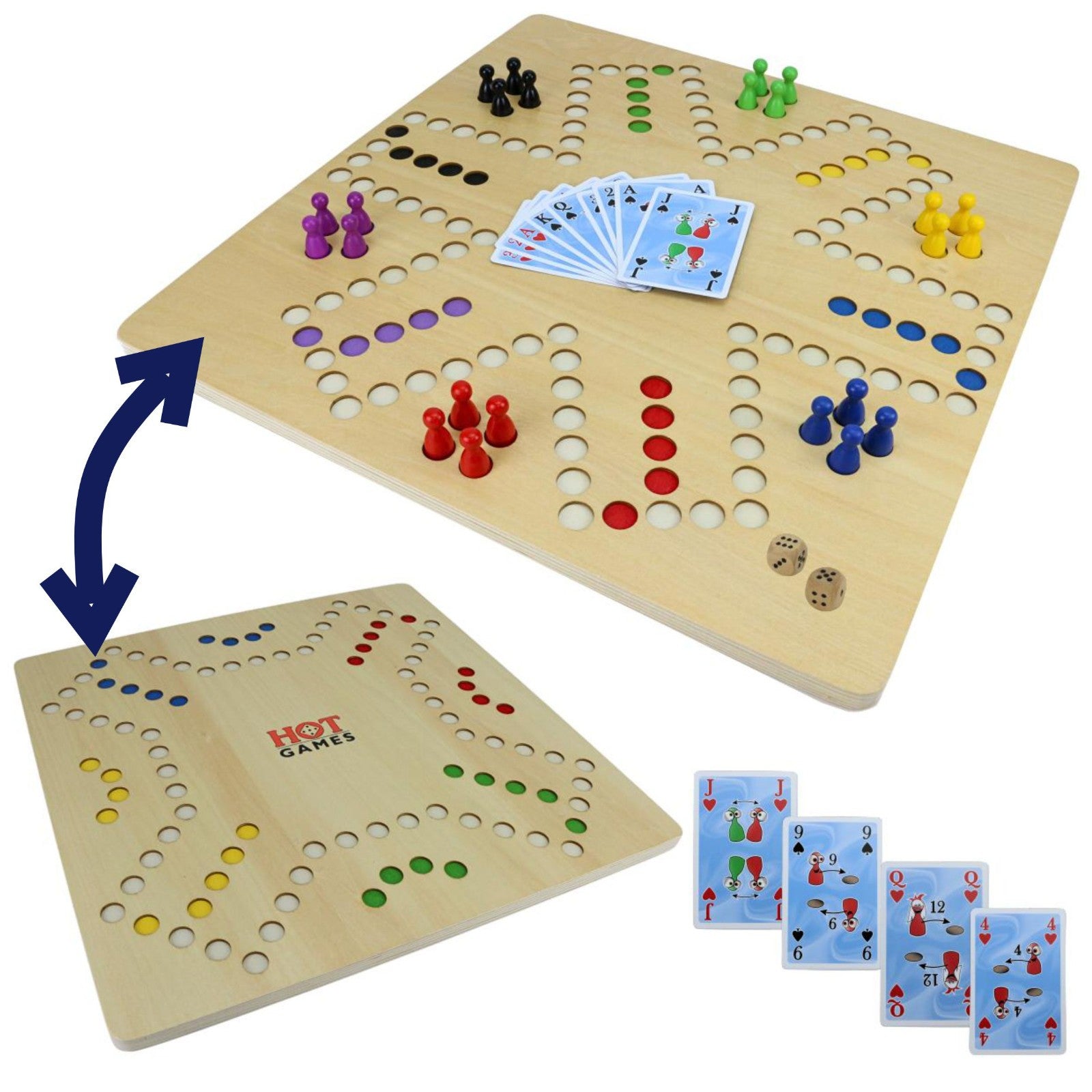 Auf dem großen, beidseitig bespielbaren Holzbrett können 2, 4 oder 6 Spieler in Teams gegeneinander antreten. Anders als beim klassischen Ludo wird hier mit Karten gezogen, die verschiedene Bewegungen ermöglichen und so strategisches Denken fördern. Die hochwertigen Holzspielfiguren und zwei Kartendecks garantieren langlebigen Spielspaß. Zusätzlich ermöglicht ein Würfel die klassische Spielvariante. Dieses Spiel schafft wertvolle Momente voller Freude und gemeinsamer Erlebnisse – perfekt für Spielnachmittage, die strategisches Denken und Gemeinschaft stärken.